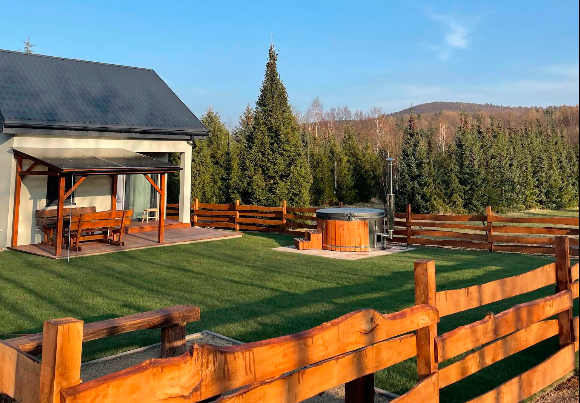 Każdy domek z prywatnym ogrodem, placem zabaw, miejscem na ognisko.