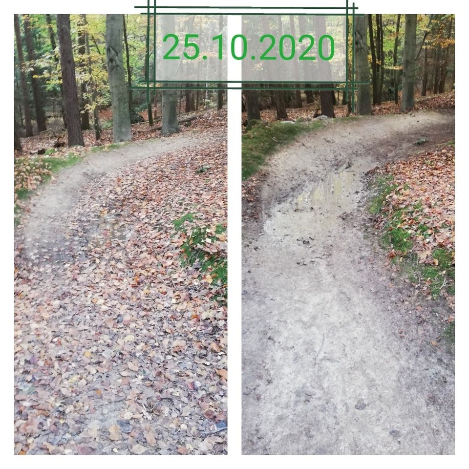 Przedwoczraj i wczoraj padał mocny deszcz w dzień i w nocy. Las jest mokry, ale ścieżka nie jest jakoś bardzo miękka. W niektórych momentach trzeba uważąć, aby nie niszczyć trasy (przy mostku, i w 2-3 miejscach tych co zwykle)