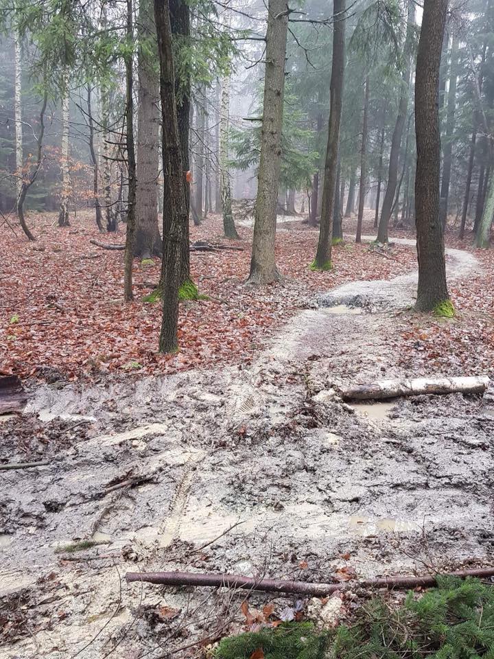 - Aktualizacja 5 listopada: Uprzątnięto trochę większych gałęzi po ostatnich wichurach. Trasa przejezdna. Dziś już nie padało, a momentami nawet było słońce. Niestety jest mokro. Zapraszamy wszystkich lubiących się ubrudzić :) Ścieżka otwarta, ale jest sporo liści - spadają codziennie w kosmicznej ilości.