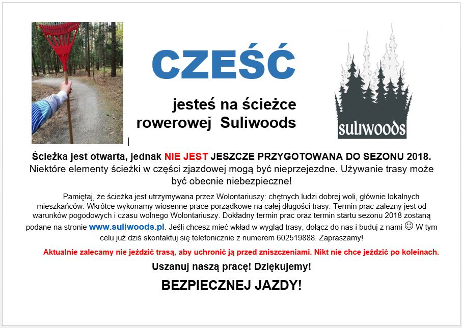UWAGA! W okolicach ścieżki Suliwoods odbywają się aktualnie prace leśne. W jednym miejscu ścieżka jest nieco potargana przez zwózkę drewna - mniej więcej w połowie tam gdzie las zmienia się z iglastego na liściasty, za prostą linią pumptracka przy skręcie w lewo na odcinku około 30m. Uważajcie, aby tam zwolnić, gdyż nawieziona ziemia w zakręcie powoduje, że jest niestabilnie. W ciągu kilku dni sytuacja powinna ulec poprawie.
