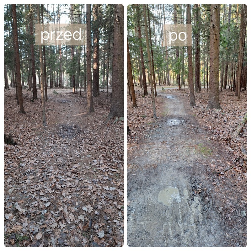 Dziś ponownie ruszyliśmy w las wykonać dość długi (parę godzin było) małżeński spacer (Piotr Szwedowski i Sylwia Szwedowska) z dzieckiem w wózku i z dmuchawą. Spaliliśmy kolejne litry benzyny. Efekt? Cała ścieżka jest specjalnie dla Was uprzątnięta i przygotowana do jazdy 🌲❤️🌲 Warunki są idealne, ścieżka jest suchutka, idealnie gładka i szybka. Pogoda ma być super, więc zapowiada się fajny weekend na rowerach w Suliwoods!